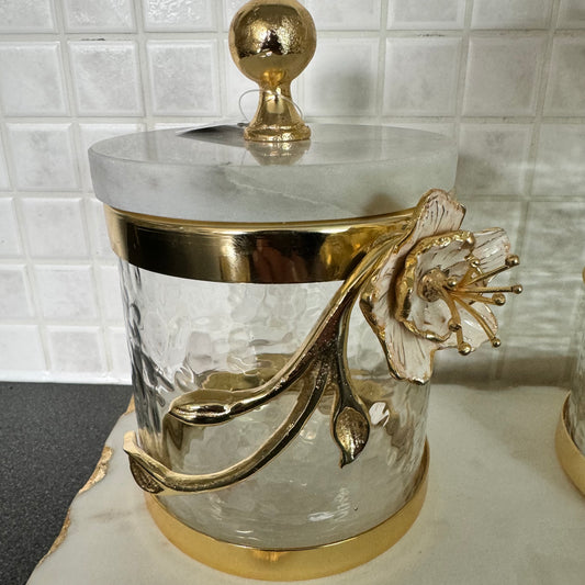 Hammered Glass Canister White Enamel and Gold Leaf Flower